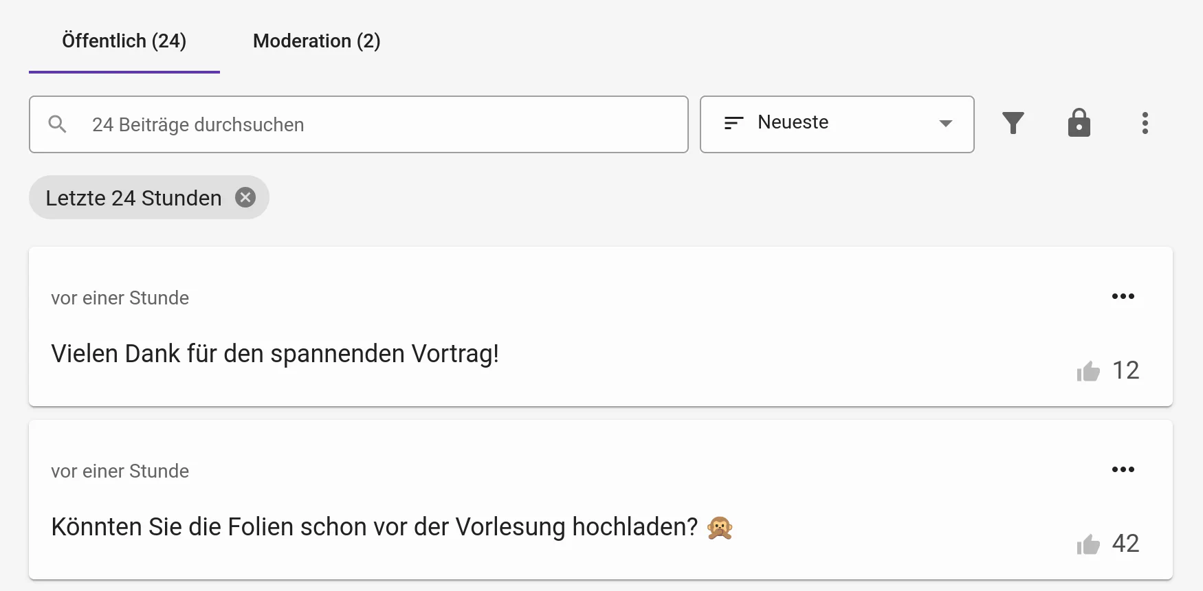 Wir haben die Such- und Filterleiste der Q&A-Funktion überarbeitet. So wird die Suchleiste und die aktuelle Sortierung jetzt immer angezeigt. Außerdem werden aktive Filter direkt angezeigt und können mit einem Klick entfernt werden.
