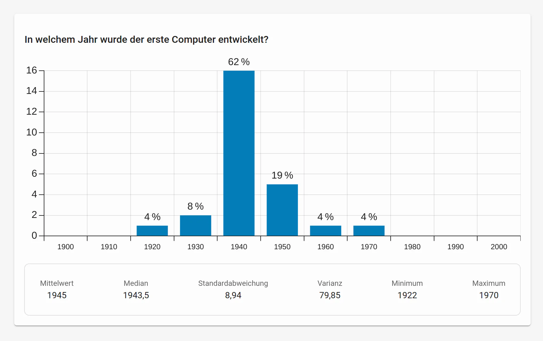 Mit dem neuen interaktiven Frageformat „Finde die Zahl“ können die Teilnehmenden mit einer Zahl in einem definierten Bereich antworten. Das Festlegen einer richtigen Antwort ist optional. Die Ergebnisse werden in einem Balkendiagramm visualisiert, welches Zahlenbereiche gruppiert. Unterhalb des Diagramms werden Statistiken wie Mittelwert, Median, Standardabweichung etc. angezeigt.