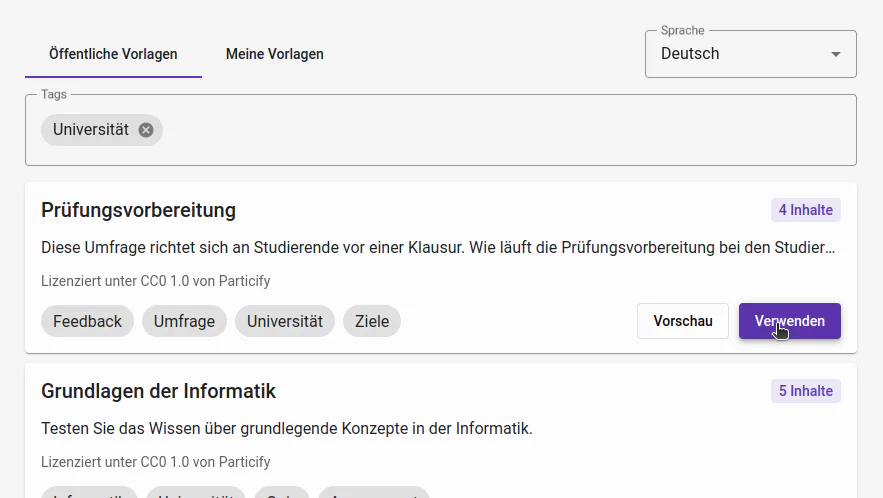 Fragenserien können jetzt mit anderen Nutzenden von Particify geteilt werden. Über das Einstellungsmenü in der Übersicht einer Fragenserie kann diese unter einer Creative-Commons-Lizenz veröffentlicht werden. Die Vorlagen können über den Punkt "Öffentliche Vorlagen" im Hauptmenü erreicht werden.