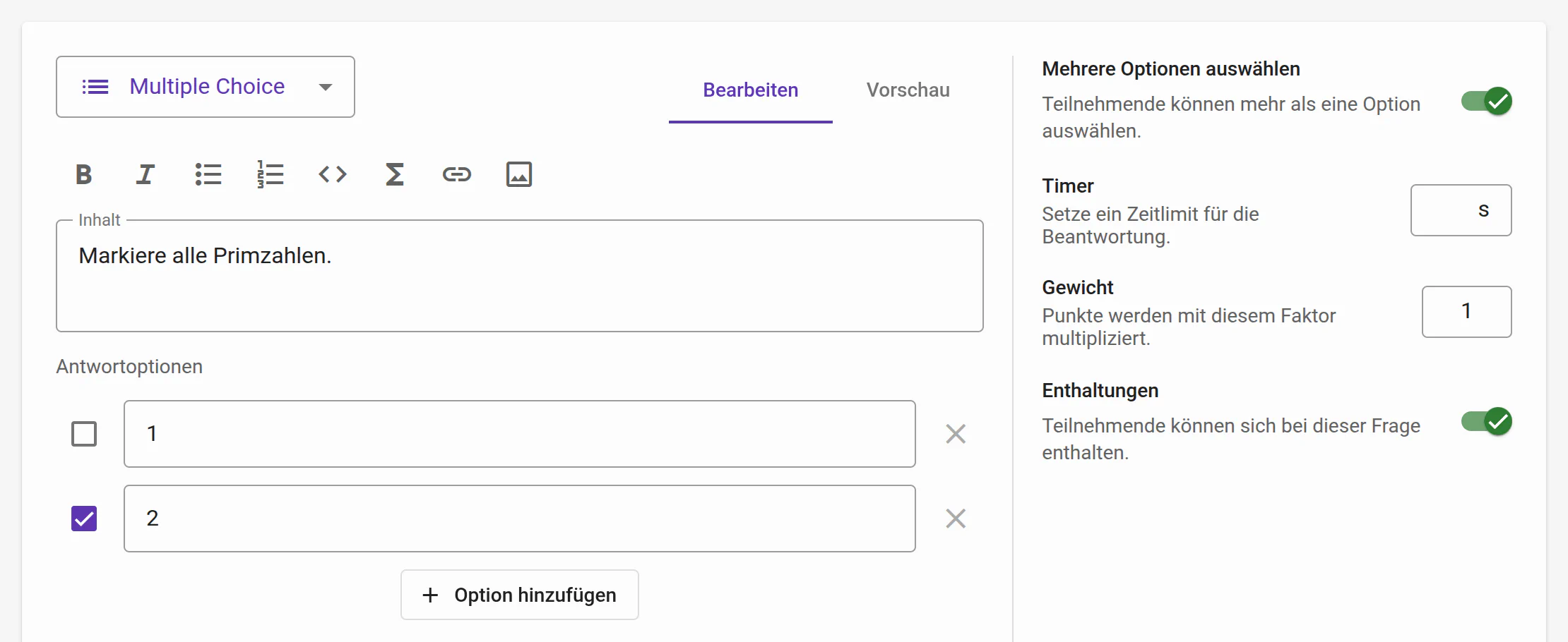 Zur besseren Übersicht werden auf größeren Bildschirmen jetzt die Einstellungen für Inhalte in einer separaten Spalte angezeigt. Das Hinzufügen/Bearbeiten/Entfernen von Antwortoptionen wurde optimiert.