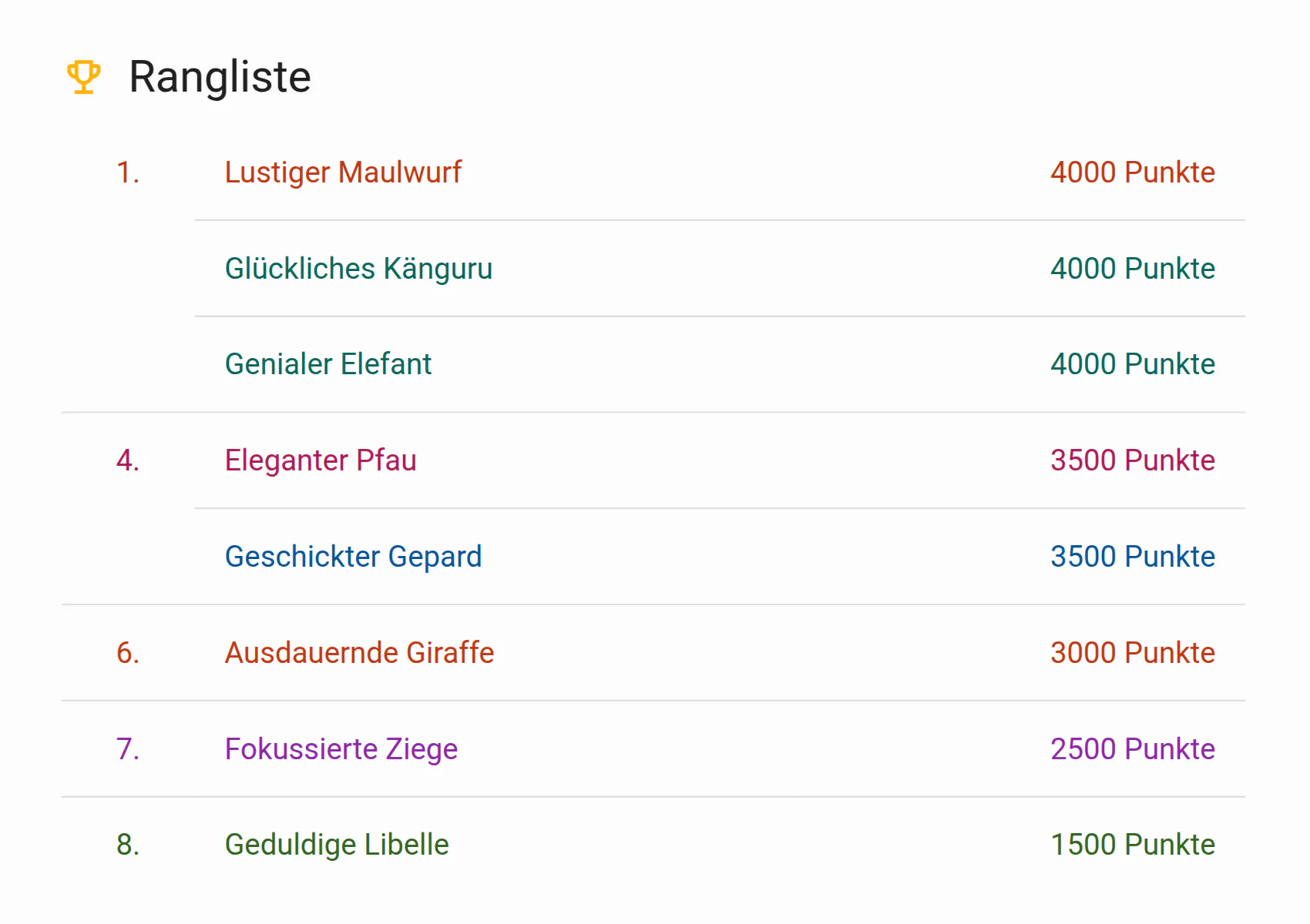 Die Positionierung der Rangliste wurde optimiert, sodass sich mehrere Teilnehmende bei gleicher Punktzahl einen Platz teilen. Außerdem werden jetzt die 100 ersten Teilnehmenden in der Rangliste angezeigt.
