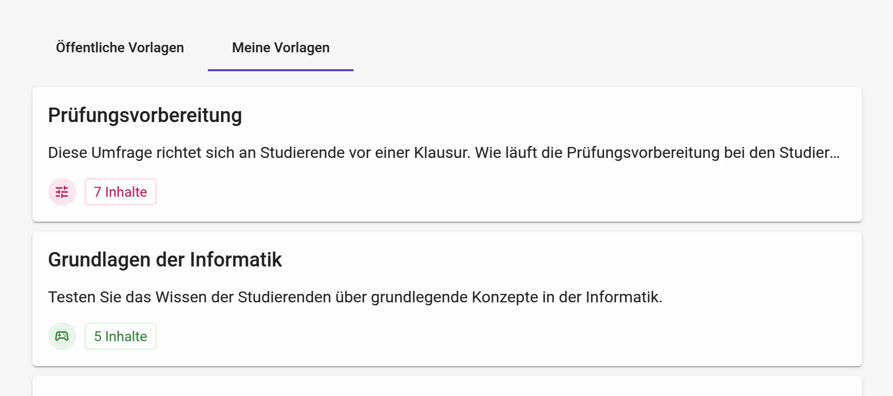 Ab sofort können auch private Vorlagen aus Fragenserien erstellt werden. Auch wenn diese nicht veröffentlicht werden, können diese mit anderen Nutzenden geteilt werden.