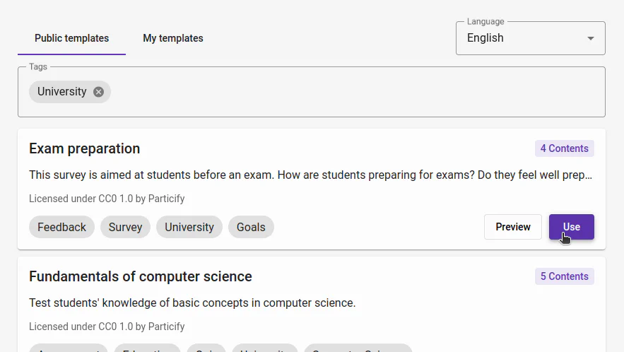 Question series can now be shared with other Particify users. Via the settings menu in the overview of a question series, it can be published under a Creative Commons license. The templates can be accessed via the "Public templates" item in the main menu.