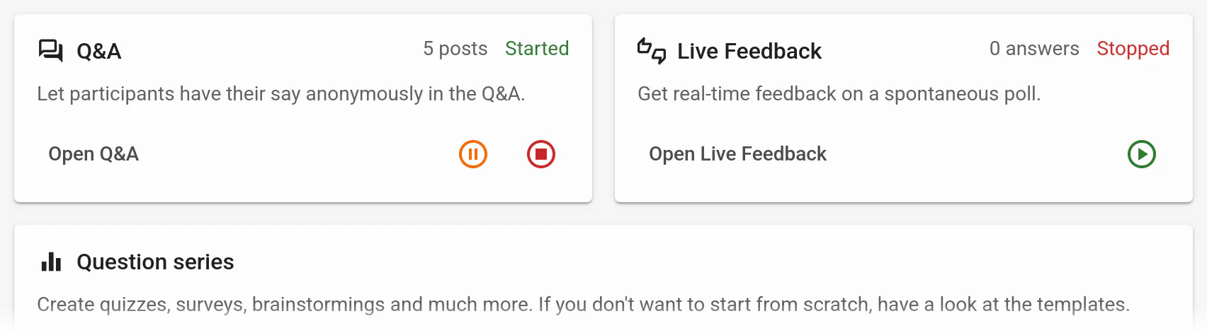 Q&A and Live Feedback can now be started or stopped directly from the overview. The Q&A can also be paused so that existing posts remain visible, but no new ones can be created.