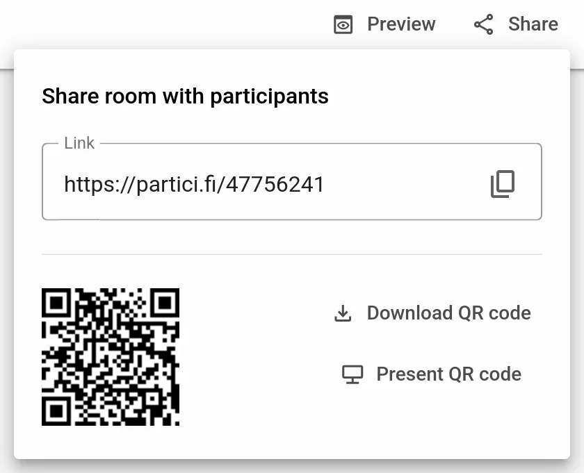 The new share button now allows you to copy the link to join from anywhere within a room. You can also download the QR code to join. This is also displayed here.