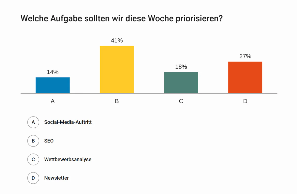 Ensure attention in meetings with anoynmous polls and let everyone participate in decision making. To constantly improve the quality of meetings, collect feedback and suggestions for improvement.